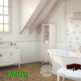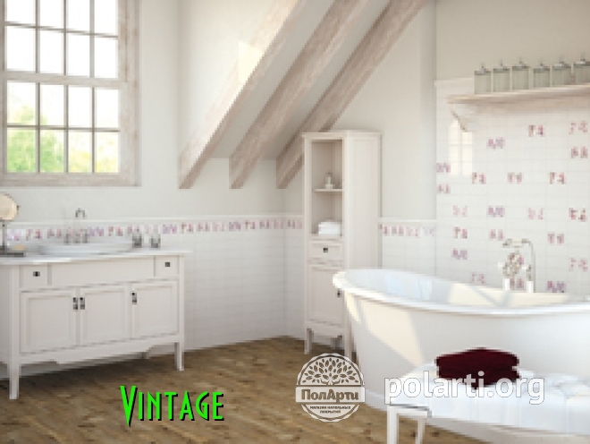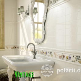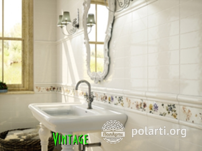 Vintage - настенная полированная керамическая плитка. Коллекция представлена однотонной фоновой плиткой, декорами с цветочным рисунком и дополнительными элементами, (7,5х30; 5х30; 2х30).